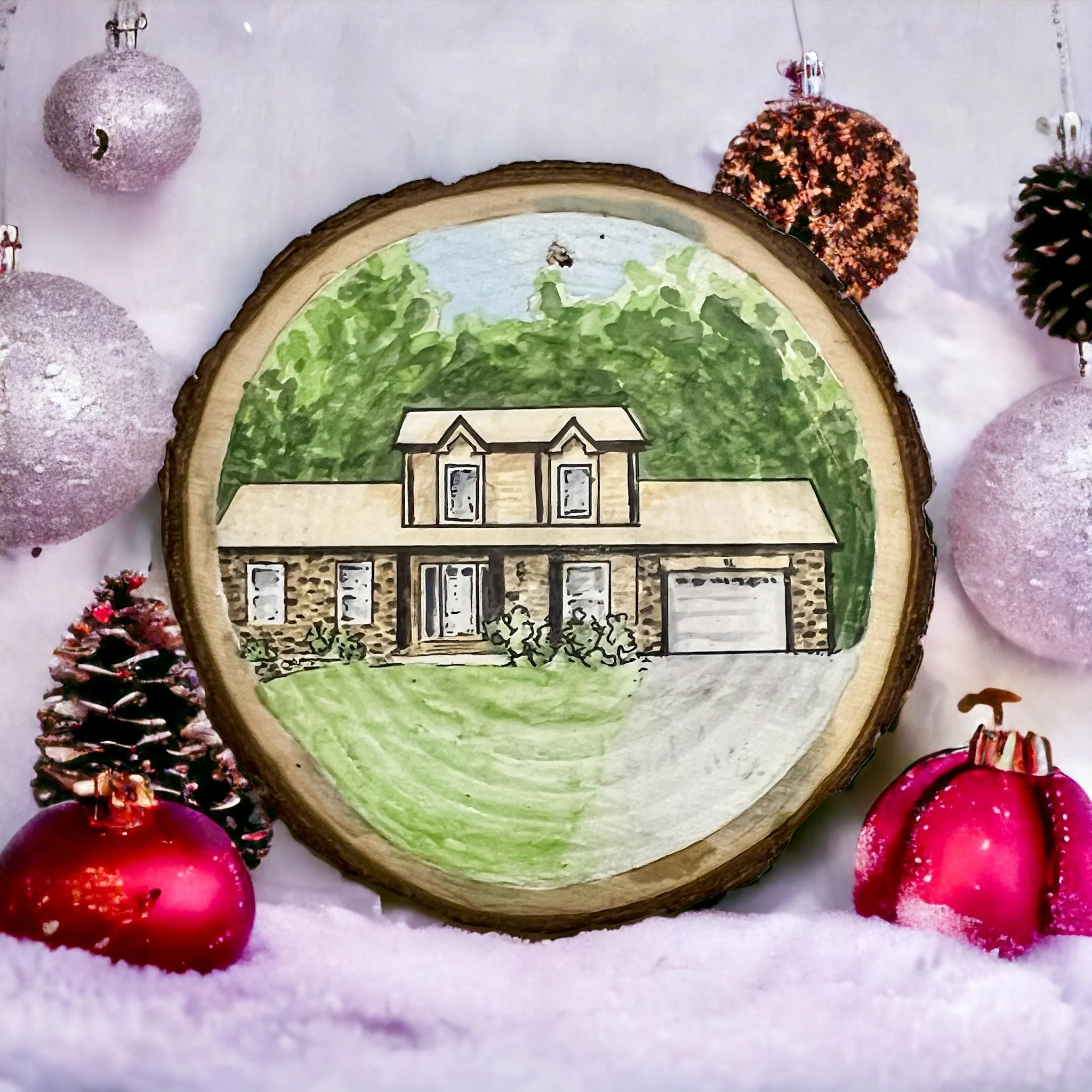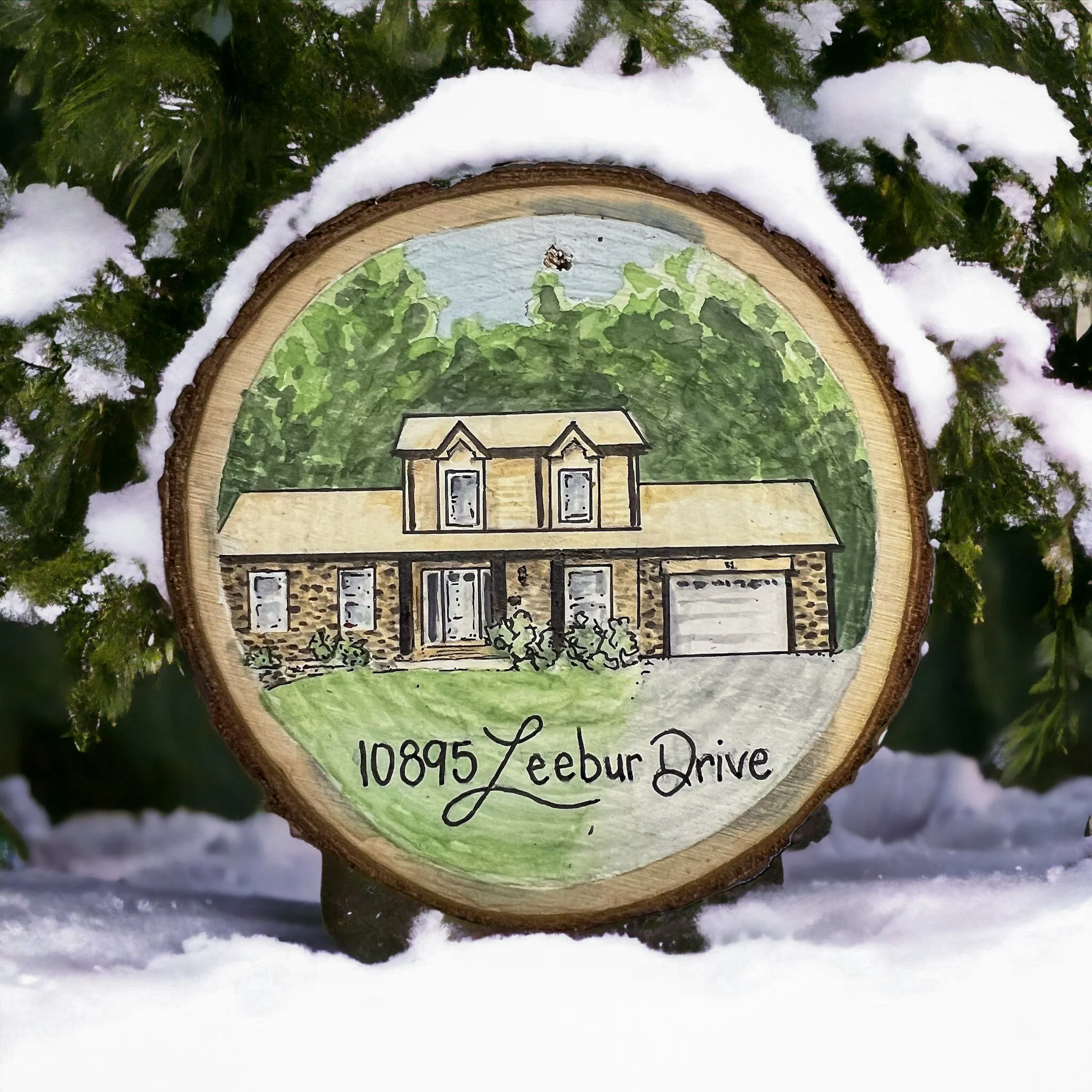 An Illustrative House Portrait Wooden Ornament created by hand using ink and watercolors. Size is approximately 3”, on a round wooden disc; discs may not be perfectly round as they are custom sliced wood which varies slightly in size and shape. Ornament will include a twine string for hanging decorated with a wooden bead.
