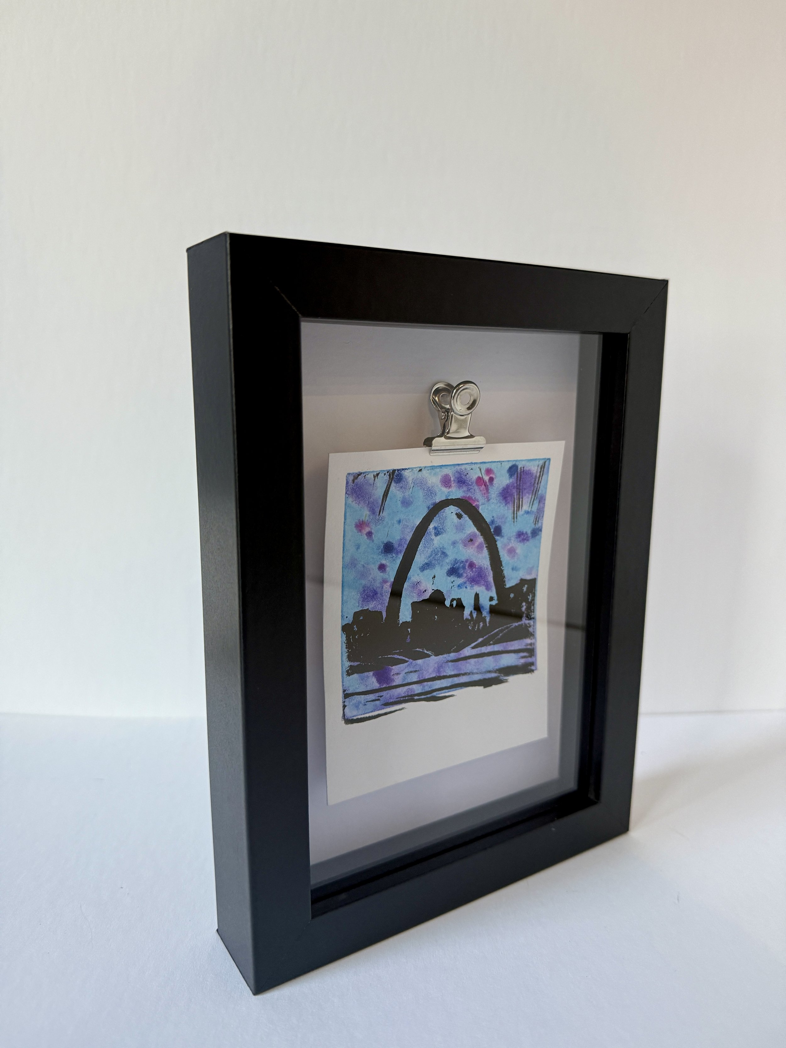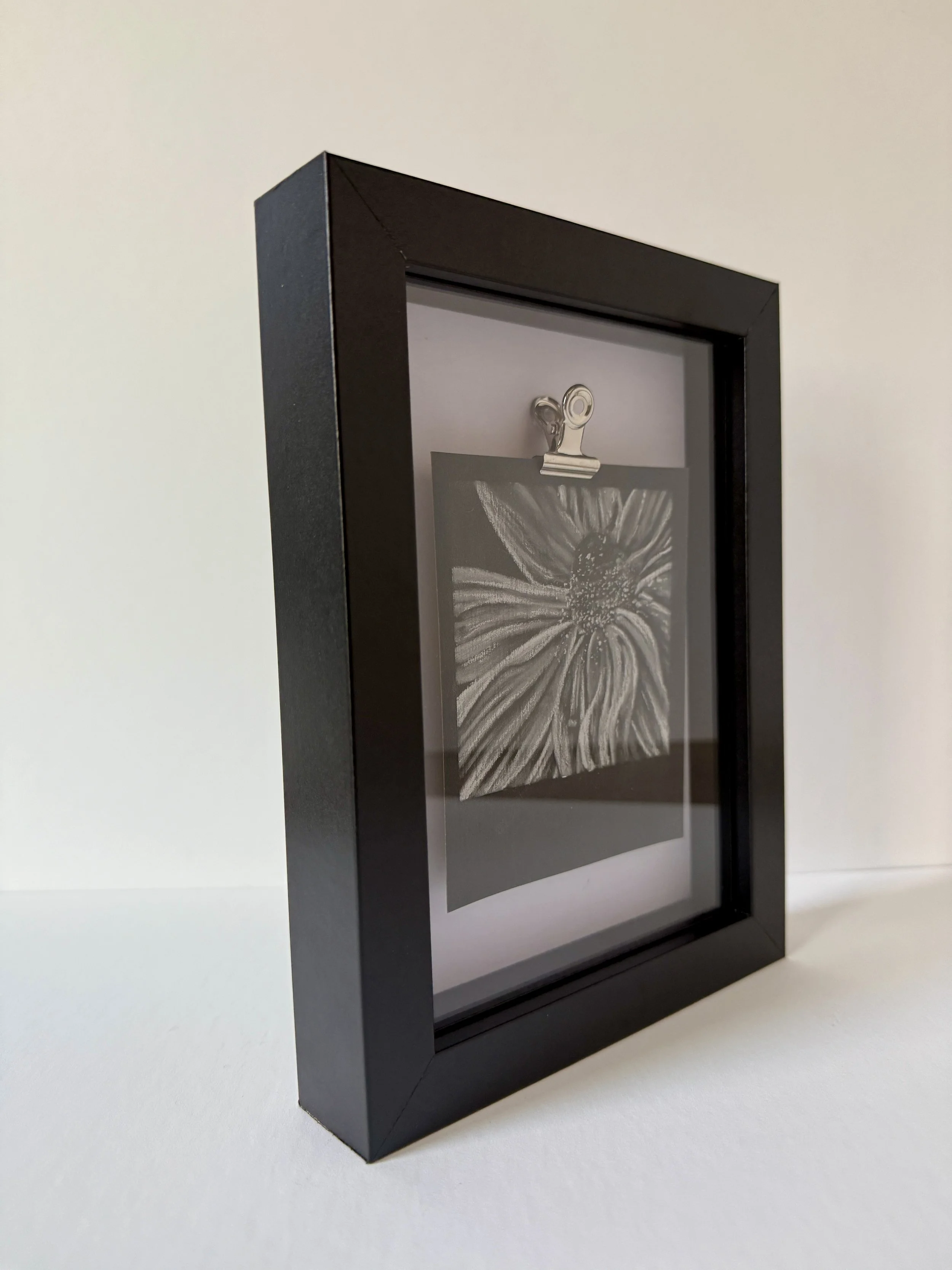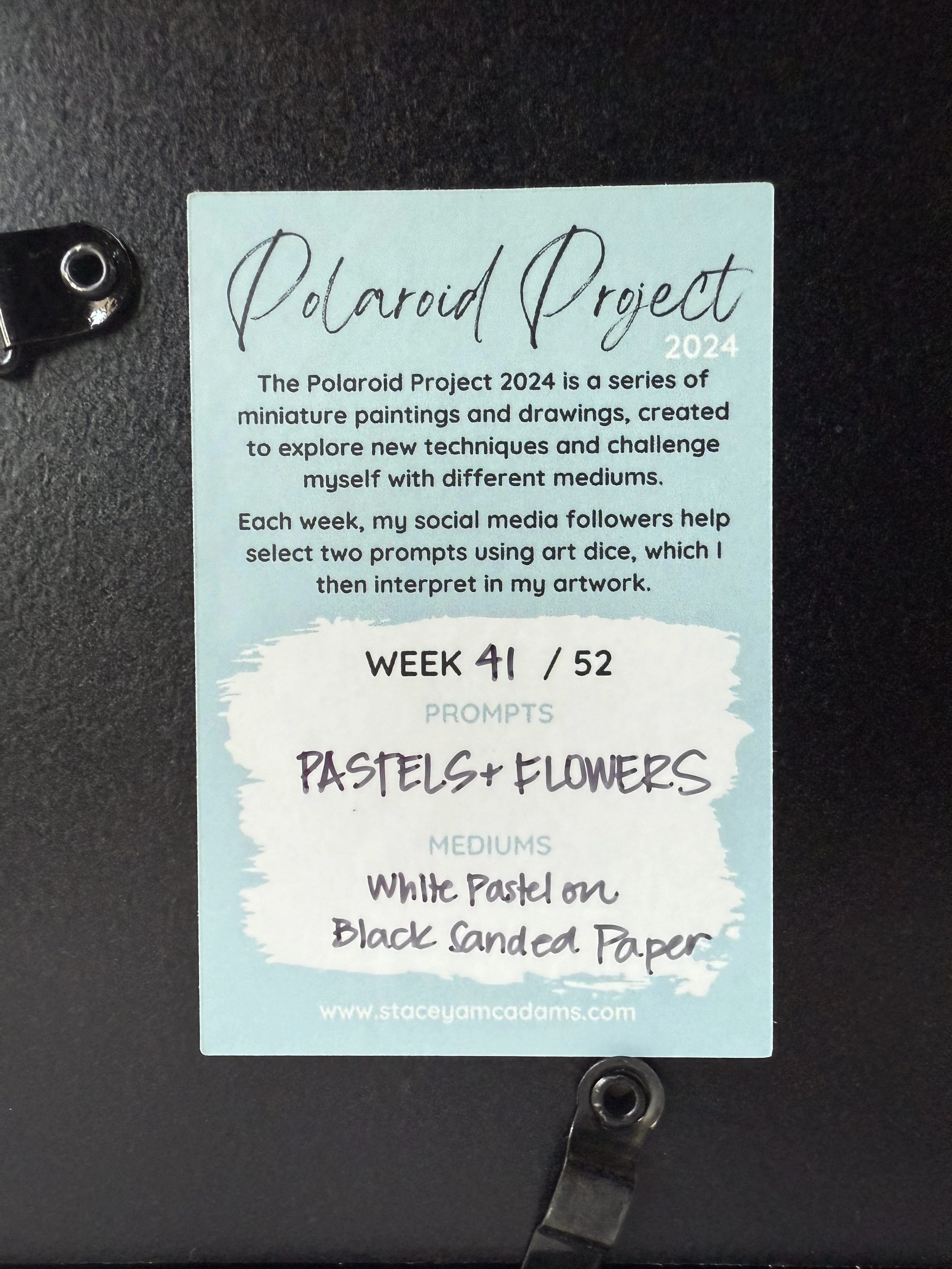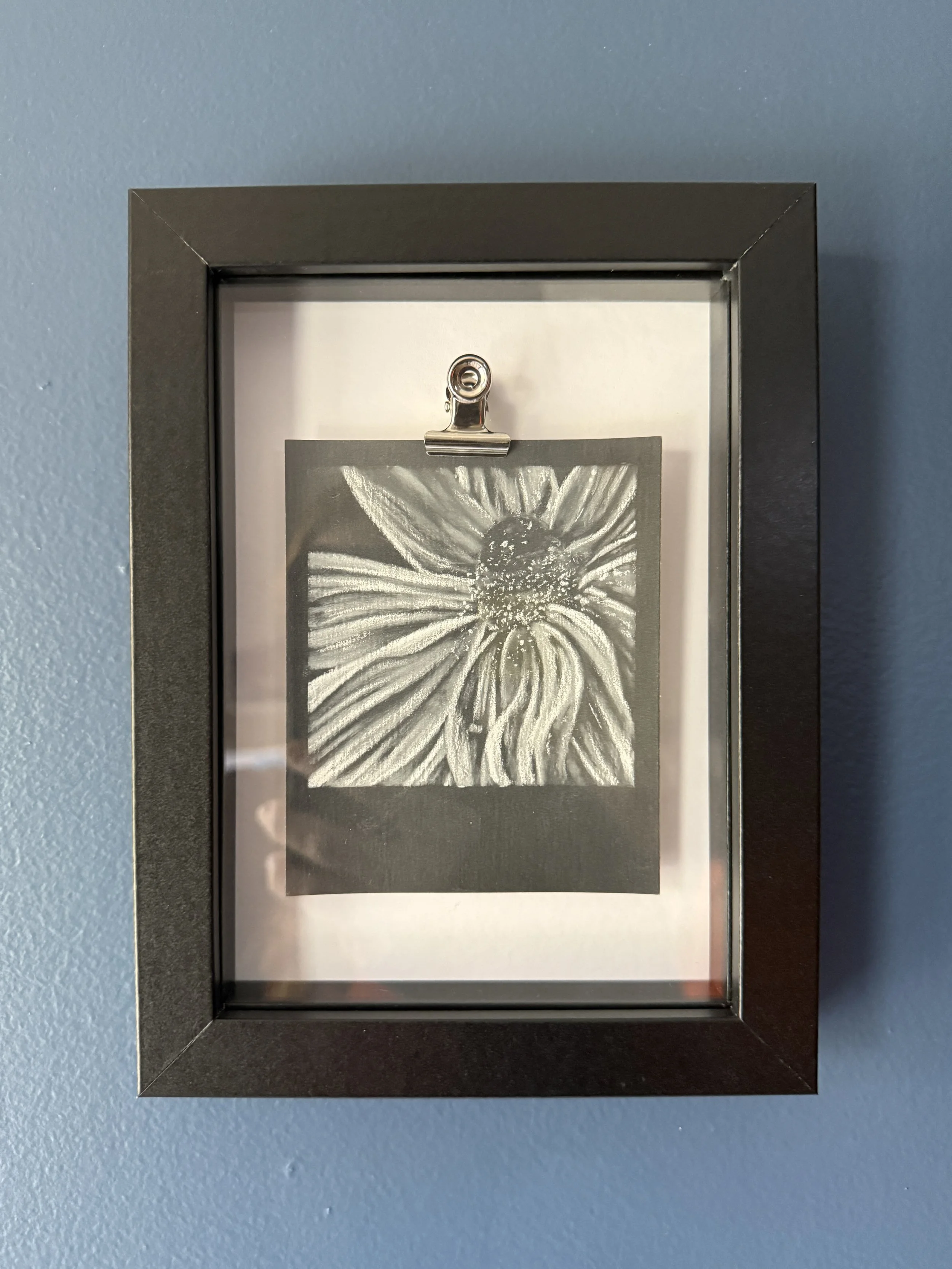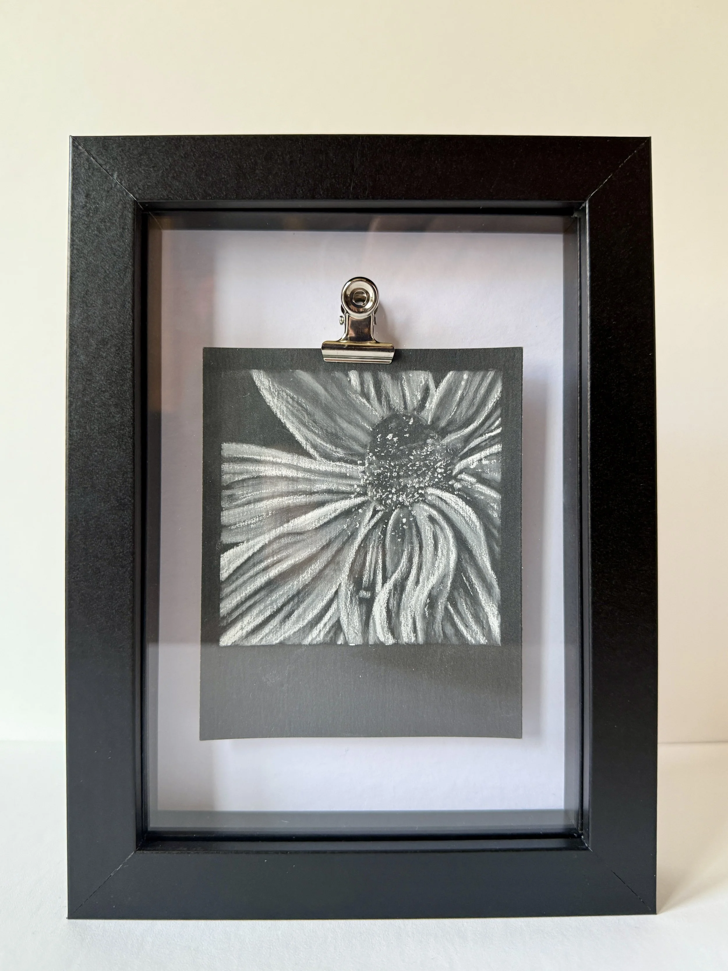 3.1 × 3” (artwork area) and 4.25 × 3.5” (total area) — size of an old Polaroid film — framed to 5×7”